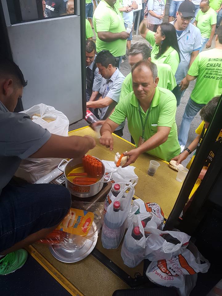 De dentro de um biarticulado, o Sindimoc improvisou um fogareiro e distribuiu sanduíches de vina (salsicha) para os trabalhadores, simbolizando a total ausência de diálogo ao longo de toda discussão da Campanha Salarial 2017 com a prefeitura de Curitiba, Urbs S/A e Comec.