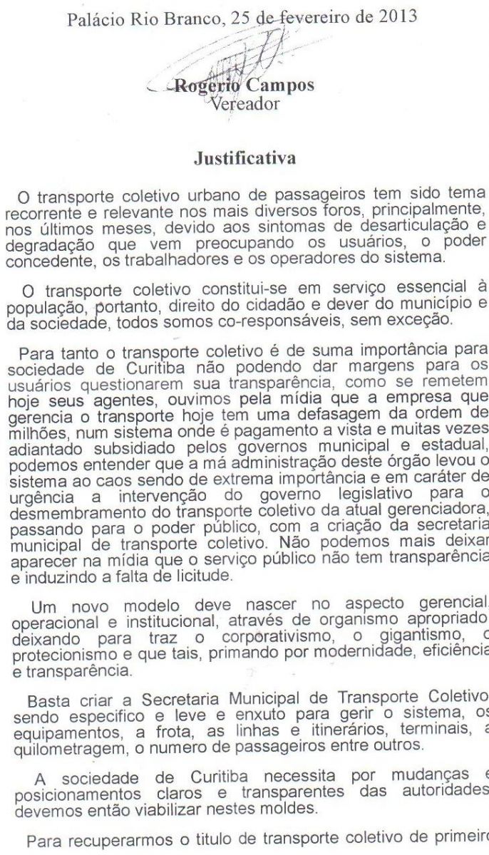 Abaixo na íntegra o documento protocolado na Câmara Municipal de Curitiba
