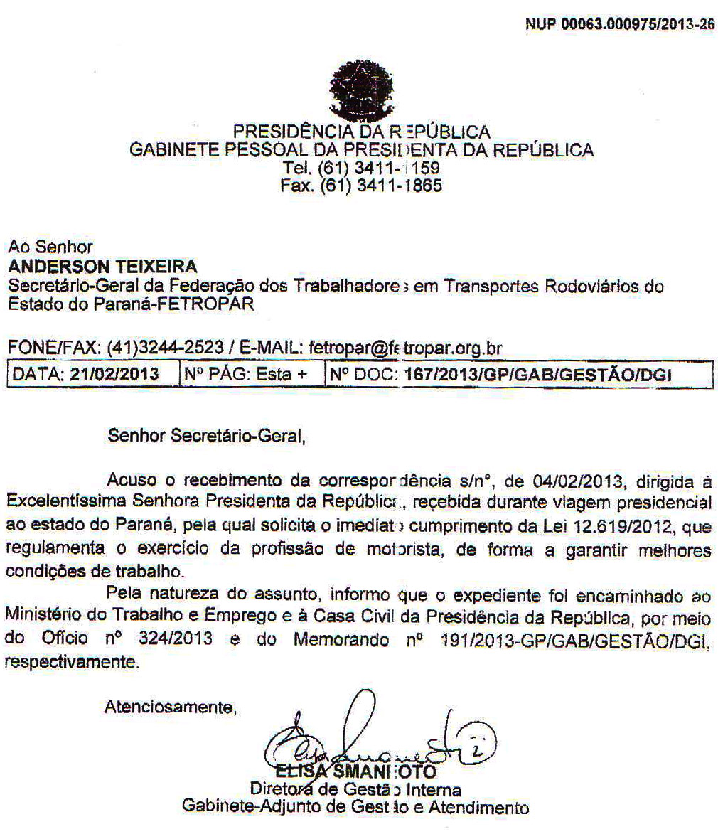Como era esperado, nesta terça-feira (26/02), houve confirmação recebimento do ofício, o qual foi expedido pelo Gabinete Presidencial, informando que o expediente foi encaminhado para o Ministério do Trabalho e à Casa Civil da Presidência da Republica.