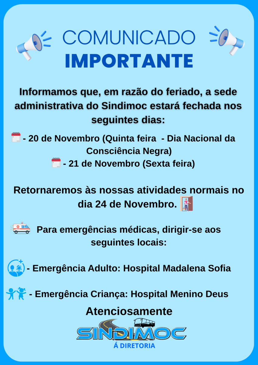 Informamos que, em razão do feriado, a sede administrativa do Sindimoc estará fechada nos seguintes dias: