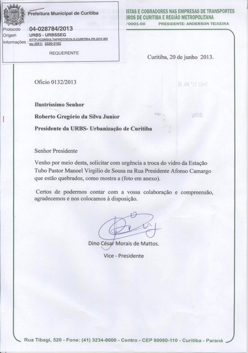 O DAT verificou em loco a existência do problema e fez o registro, solicitando por ofício à direção da Urbs a recolocação do vidro que está faltando na citada estação-tubo. O SINDIMOC está certo de que o pedido será atendido mediante a necessidade de se resolver o problema.