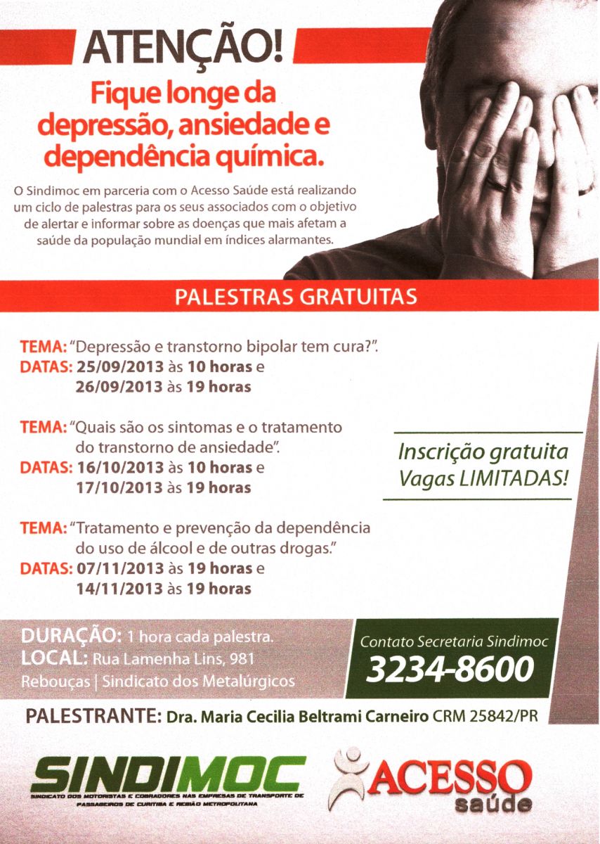 O Sindimoc convida a sua categoria de trabalhadores para participar das palestras, as quais serão gratuitas e ministradas na sede do Sindicato dos Metalúrgicos (Rua: Lamenha Lins, 981, Bairro: Rebouças, Curitiba).
