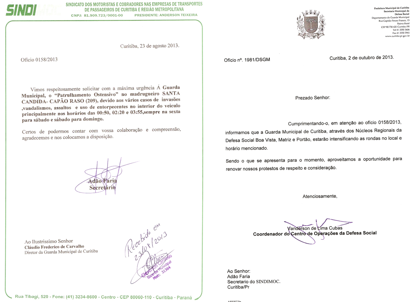 Atendendo solicitação do DAT (Departamento de Apoio ao Trabalhador), pertencente ao Sindimoc, a Guarda Municipal de Curitiba, respondeu à ofício, o qual pedia ao orgão público patrulhamento ostensivo no Terminal do Santa Cândida.