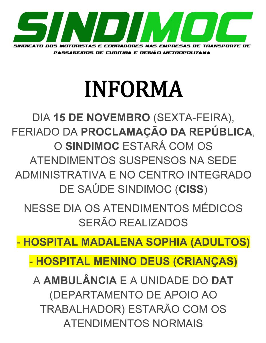 Feriado da Proclamação da República, veja como ficam os atendimentos no Sindimoc