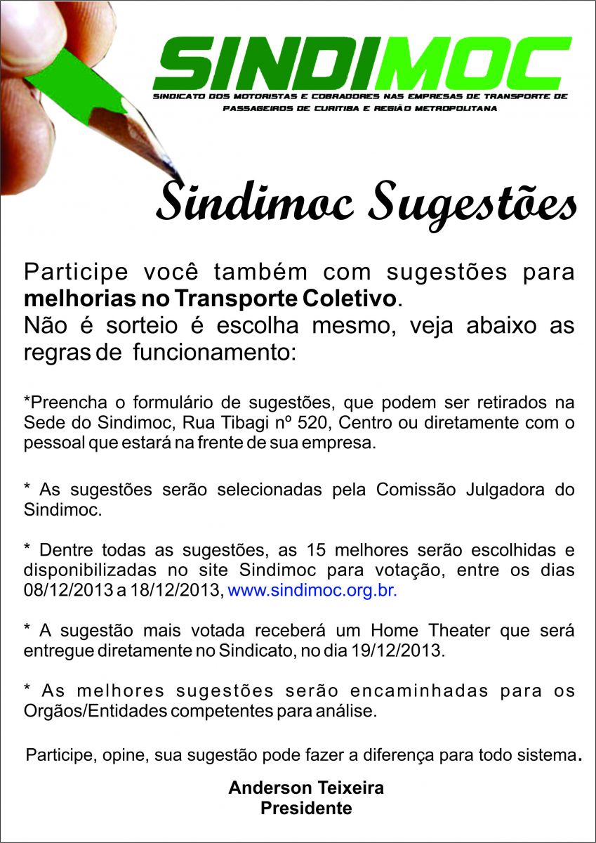 O Sindimoc sempre priorizando a sua categoria, lançou a campanha "Melhorias no Transporte Coletivo", acreditamento que os Motoristas e Cobradores têm muito para contribuir para a melhoria no transporte coletivo de Curitiba e Região Metropolitana.