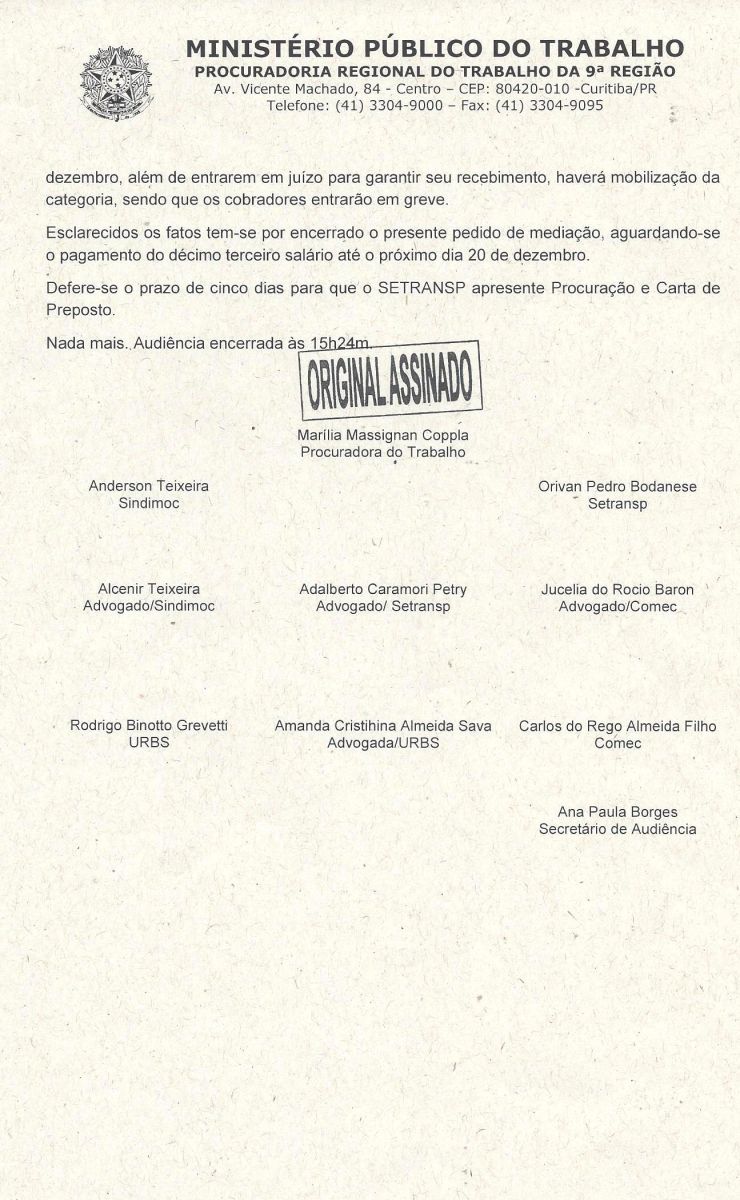 O Sindimoc informa que participou de audiência no Ministério Público do Trabalho, na tarde desta quarta-feira (19/12), junto com o Setransp, Urbs e Comec, onde o representante do patronal declarou que as empresas do transporte coletivo de Curitiba e Região Metropolitana deverão realizar o pagamento da segunda parcela do 13º salário até o dia 20 aos Motoristas e Cobradores.