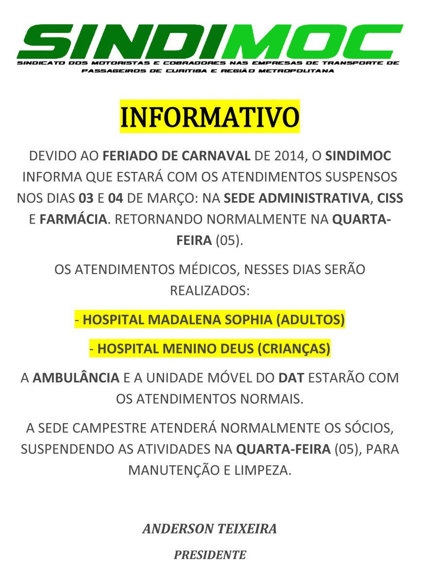 Sindimoc informa seus associados que devido ao Feriado de Carnaval de 2014 terá alguns atendimentos suspensos nos dias 03 e 04 de março.