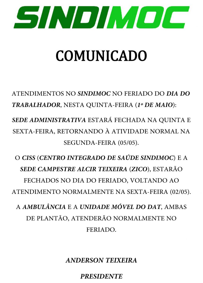 Atendimentos no Sindimoc no feriado do Dia do Trabalhador