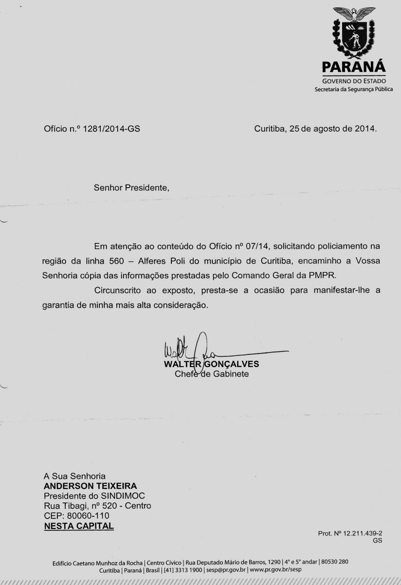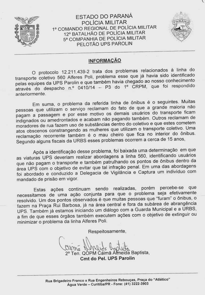 Atendendo solicitação dos operadores que fazem a linha 560 - Alferes Poli - os quais eram constantemente importunados por usuários mal intencionados do transporte coletivo , entre eles os "fura-catraca", que invadiam os ônibus e não pagavam passagens, o Sindimoc, representando os Motoristas e Cobradores, enviou ofício à Secretaria de Estado da Segurança Pública do Paraná (SESP/PR) pedindo providências.