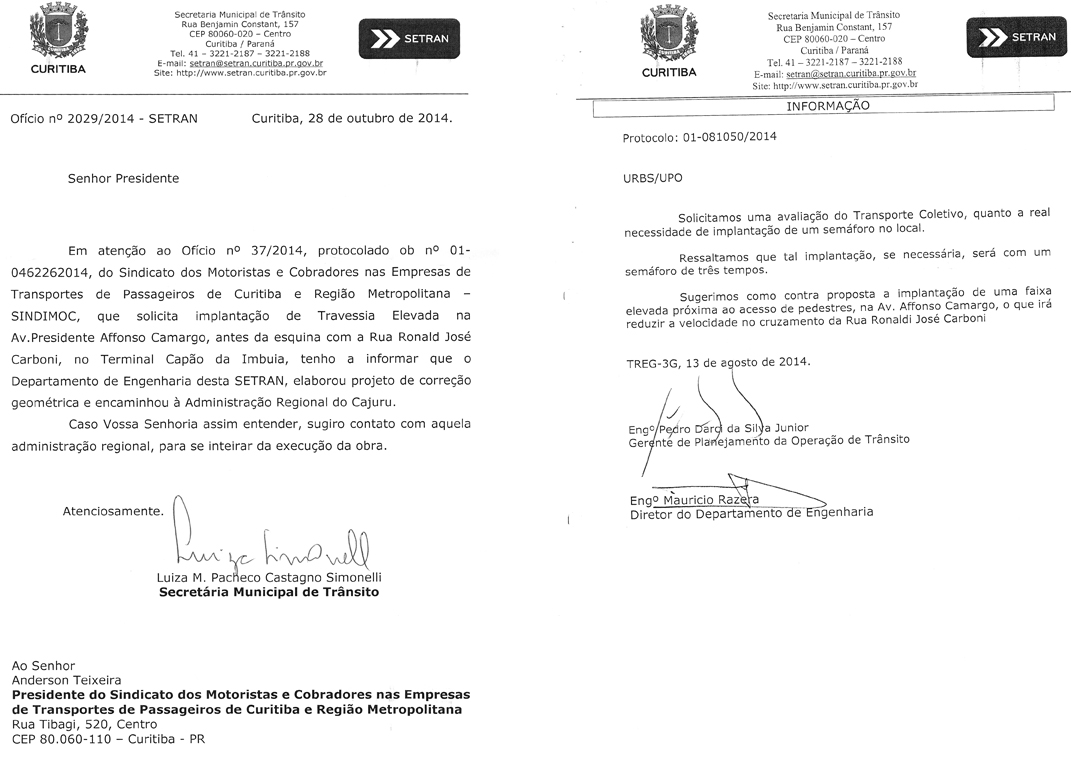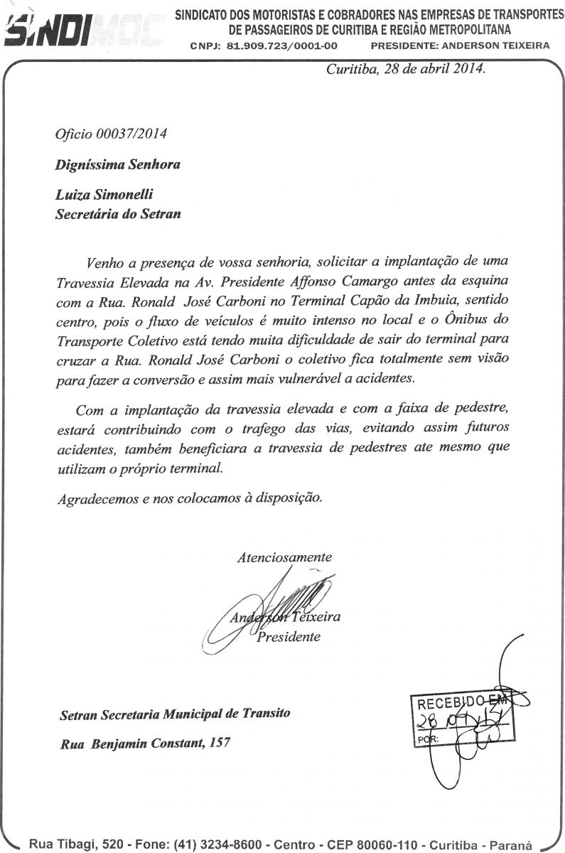 O Sindimoc atendendo pedido de Motoristas do transporte coletivo, enviou ofício à Secretaria de Trânsito de Curitiba (Setrans) solicitando travessia elevada próximo ao Terminal do Capão da Imbuia.