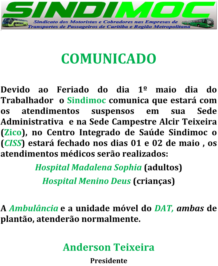 Atenção filiados: Funcionamento do Sindimoc no dia 1º de maio